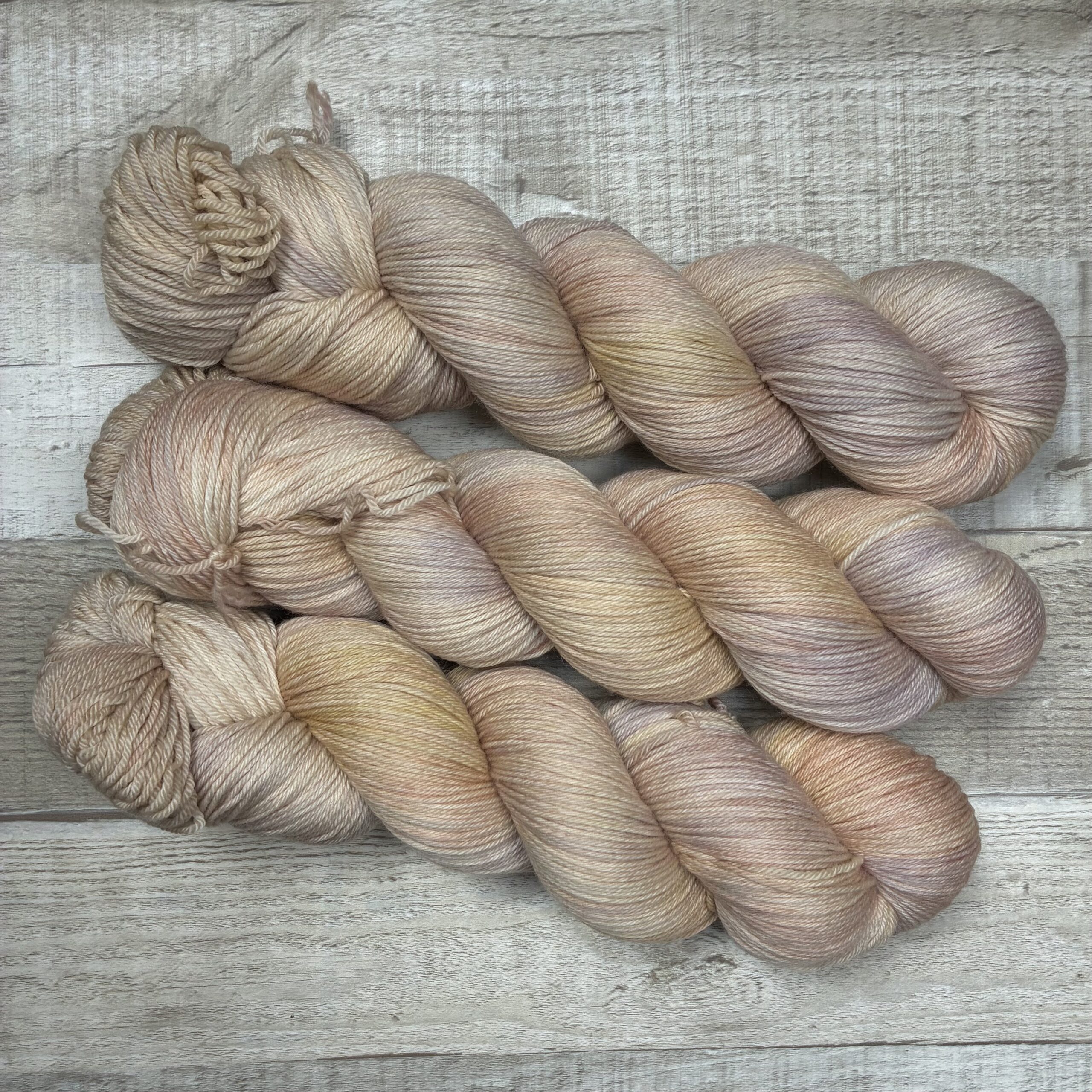 Blewit is a hand dyed variegated yarn colorway that features a creamy base with soft golds, burnt oranges, purples.